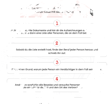 Schlüpfe in die Rolle eines echten Detektivs und löse spannende Fälle, die deine Fähigkeiten auf die Probe stellen. Ob ein rätselhafter Mord oder ein raffinierter Diebstahl - mit unseren Fällen tauchst du tief in die Ermittlungen ein, ausgestattet mit realistischen Beweismitteln und der Akte des ursprünglichen Ermittlers.