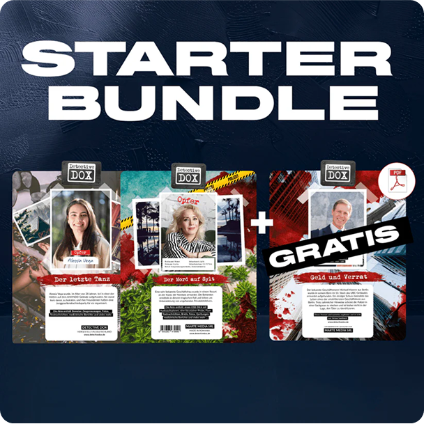 Du wolltest schon immer selbst in die Rolle eines Ermittlers schlüpfen? Mit dem Starter Bundle bekommst du den perfekten Einstieg in die Welt von Detective Dox – mit unseren beliebtesten und meistverkauften Fällen.